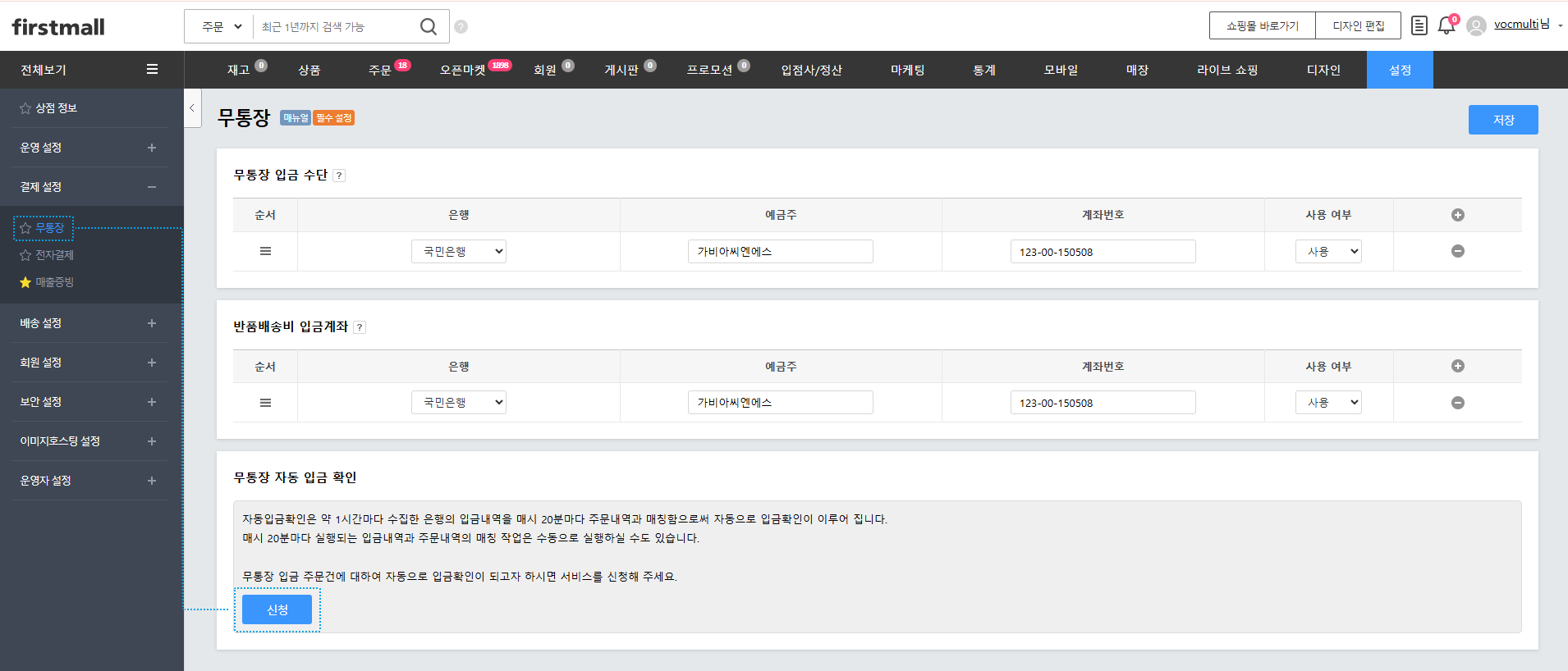 [설정]-[무통장] 페이지 하단 [무통장 자동 입금 확인] 메뉴에서 [신청]을 클릭해서 신청하면 됩니다.