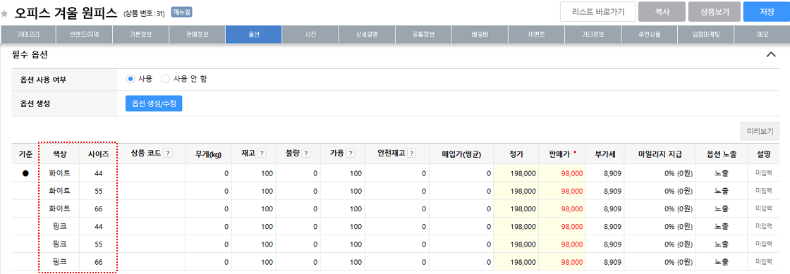 ■ 필수 옵션: 해당 상품의 속성을 선택하는 옵션입니다. 색상, 사이즈, 용량 등의 옵션을 선택할 때 주로 이용하게 됩니다.