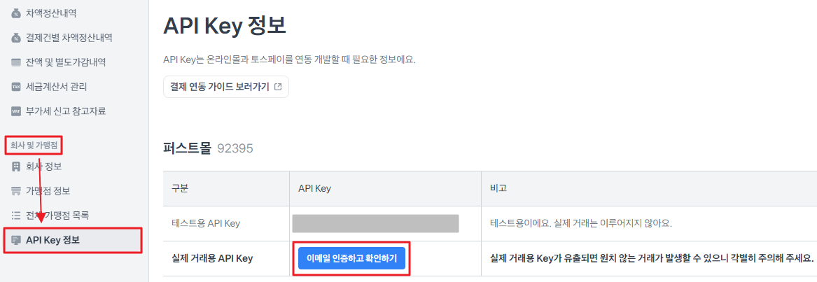 - 실제 거래용 API KEY : 토스페이 파트너스 > 회사 및 가맹점 > API KEY정보 > '실제 거래용 API KEY '