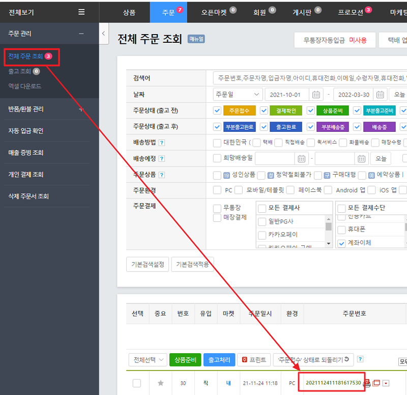 1. '주문 > 주문 관리 > 전체 주문 조회' 에서 환불할 주문의 '주문번호'를 클릭합니다.
