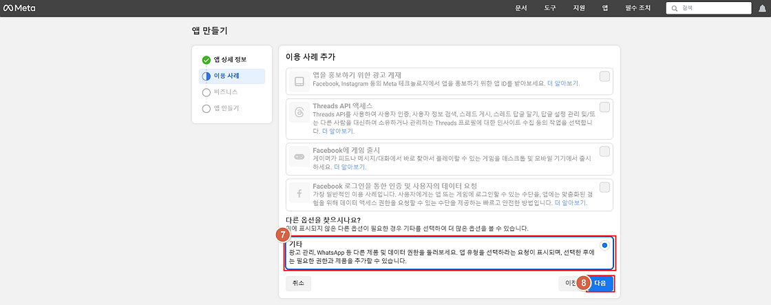 4. 생성할 앱 이름 및 담당자 이메일 입력 후 '다음'을 클릭한 후 다름 화면서에 기타 선택하고 '다음'을 선택 합니다.