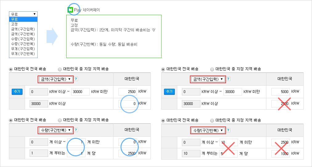 4. 네이버페이는 ‘무료’, ‘고정’, ‘구매금액(구간입력)’ , ‘구매수량(구간반복)’ 기준으로 설정된 기본 배송비일 때 결제됩니다. 단, ‘구매금액(구간입력)’ 기준일 때는 구간은 2단계이어야 하며, 마지막 구간의 배송비는 ‘0’(무료)이어야 합니다. 또한, ‘구매수량(구간반복)’ 기준일 때는 반복 구간의 수량이 동일하며, 배송비도 동일해야 합니다. 아래 화면을 참조하세요.