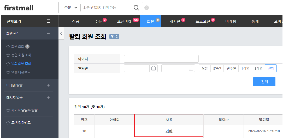'회원 > 회원 관리 > 탈퇴 회원 조회'에서 탈퇴한 회원의 사유를 확인하실 수 있습니다.