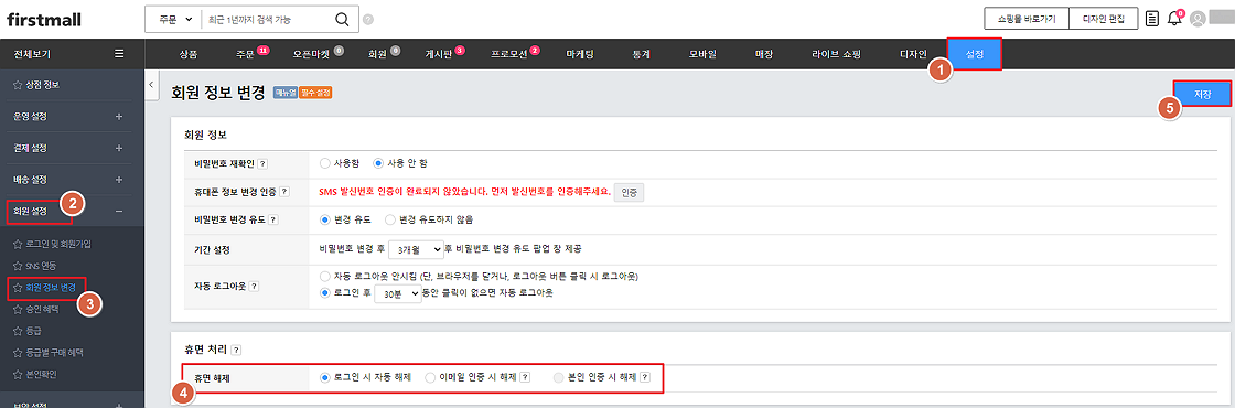 1. '설정 > 회원설정 > 회원 정보 변경 > 휴면 처리'에서 변경 후 저장합니다.