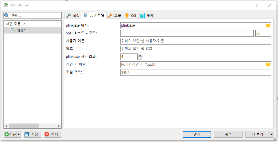 4. 다음으로 'SSH 터널' 탭을 클릭하신 후 정보를 입력해주세요.