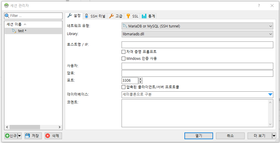 ① 네트워크 유형 : MariaDB or MySQL (SSH tunnel) 선택