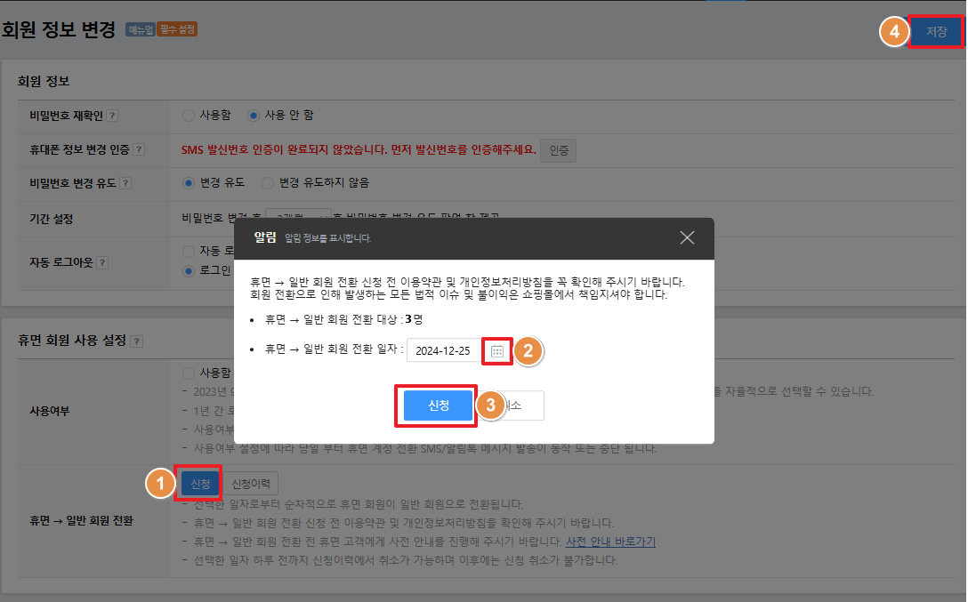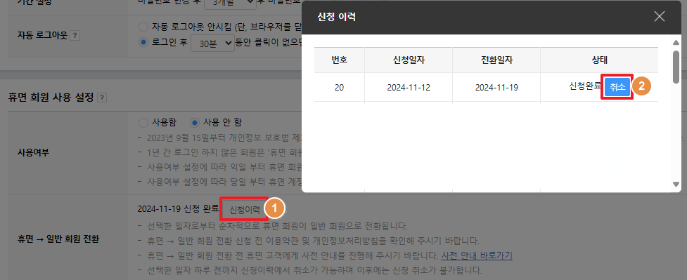 '휴면 → 일반 회원 전환'에서 '신청' 버튼을 통해 전환일자를 선택 후 우측 상단 '저장'버튼까지 클릭해 주셔야 신청이 완료됩니다.