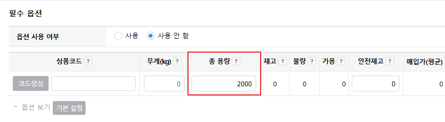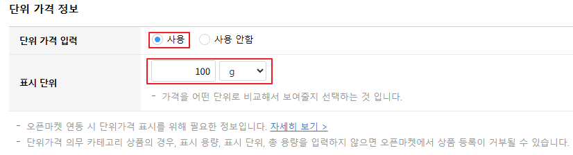 먼저 단위 가격 입력 '사용'으로 선택 후 표시 용량 및 단위를 입력합니다.