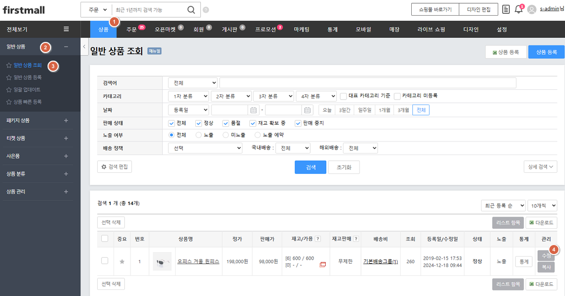 [상품 > 일반 상품 > 일반 상품 조회]에서 상품의 '수정'을 클릭합니다.
