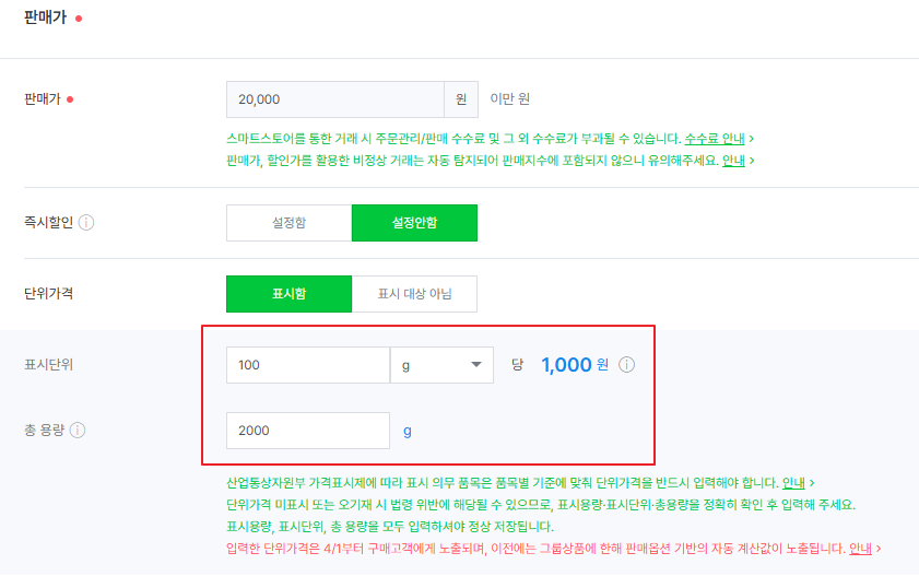 설정 후 스마트스토어로 상품 등록 시 아래와 같이 단위 가격이 연동됩니다.