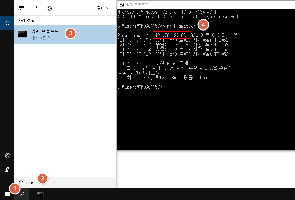 1. 윈도우의 '검색' 아이콘을 클릭한 후, 2. cmd 라고 입력합니다. 3. 명령 프롬프트를 클릭하여 실행합니다. 4. 명령 프롬프트에서 'ping 쇼핑몰 도메인'을 입력후 실행하면 이용하시는 쇼핑몰 서버의 IP를 확인하실 수 있습니다.